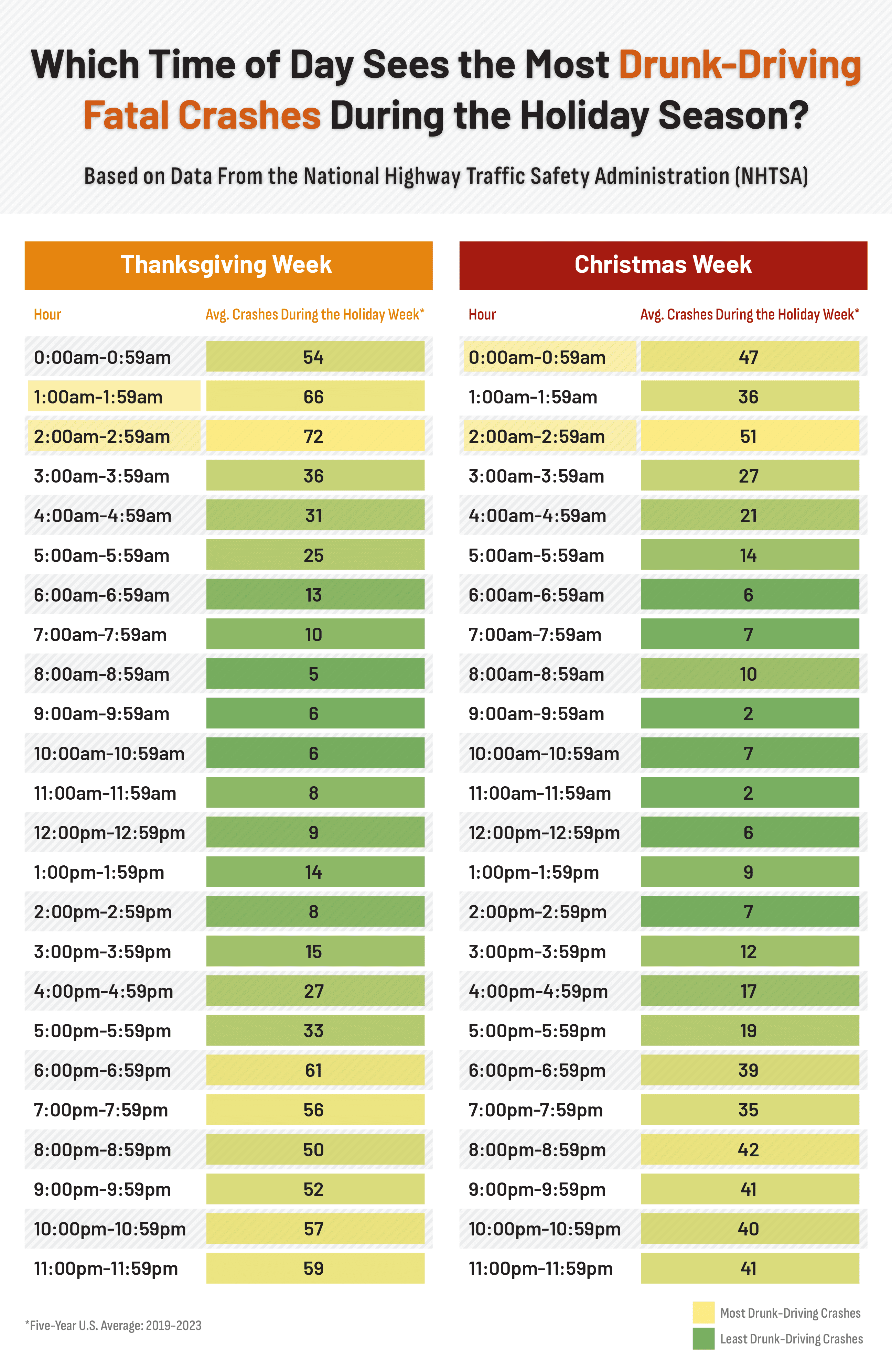 During Thanksgiving week, the deadliest hours for drunk-driving fatalities occur between 1 a.m. and 3 a.m., with 72 crashes at 2 a.m. and 66 crashes at 1 a.m. Crashes rise again after 6 p.m., with 61 recorded at that hour and consistently high levels through midnight.