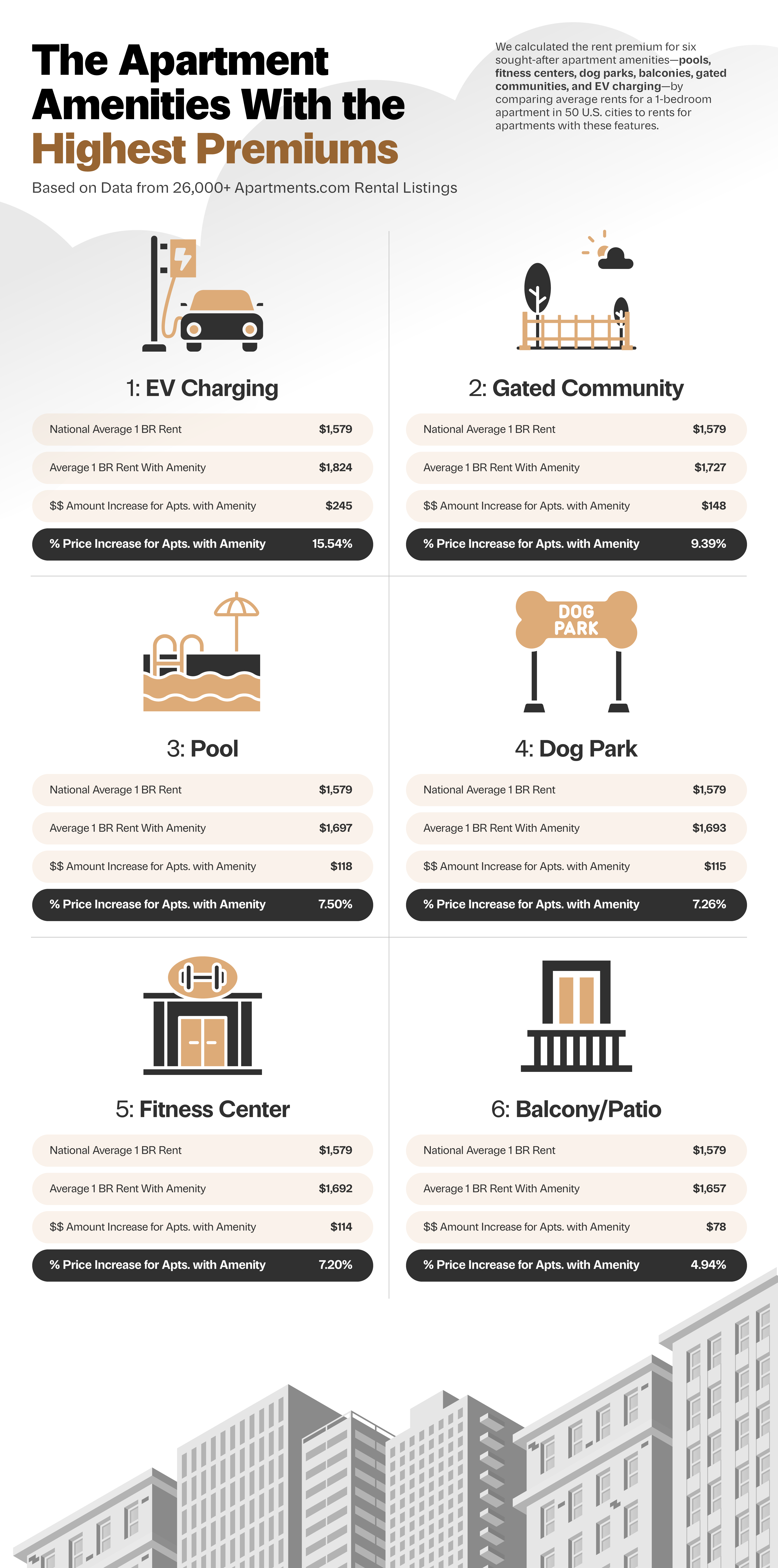 Our search for an answer led us to some interesting discoveries. Using data from over 25,000 Apartments.com rental listings, we found the premiums renters can expect to pay for six high-demand apartment complex amenities—pools, fitness centers, dog parks, balconies/patios, gated communities, and EV charging—in 50 U.S. cities. Read on to discover which amenities come at the highest premiums and where!
